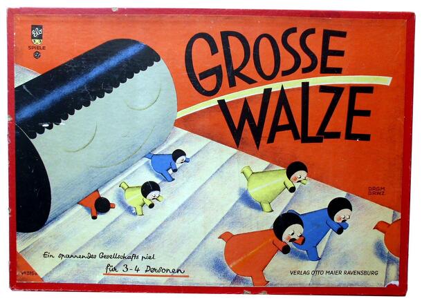 Objective: A.) become owner of 'Die Grosse Walze' ='Big Barrel' catching more than 50 % of your opponents - or B.) save most of your meeples (more than any other); but 'Big Barrel' must catch less than 50 % of all, only - moving by turn; sequence: green, yellow, red, blue - 1 roll the die inserting all of your meeples (8) first 2 try to become owner of...