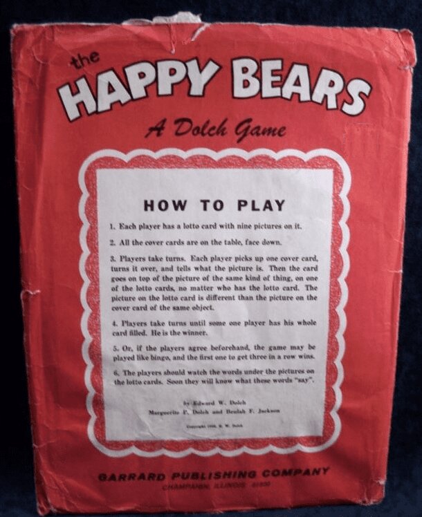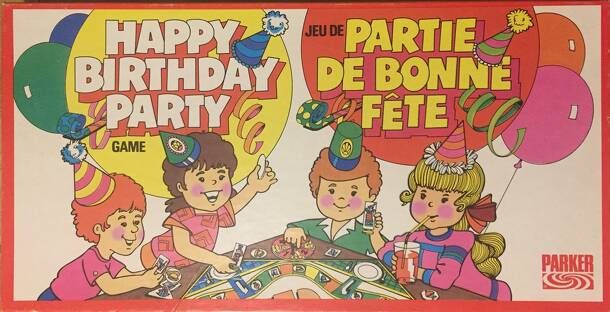 Description from the back of the box: "Anytime is party time in this delightful game of birthday surprises! Each player selects a character piece, choosing betweeen a doll, a jack-in-the-box, a tin soldier and a stuffed bear. Players then take turns spinning the spinner and moving their character piece around the colourful board. Colour recognition and...