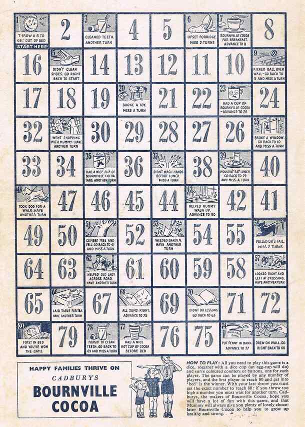 Cadbury advert/game from The Champion Annual for Boys in 1950. At this time, Cadbury often used the back of children's annuals to advertise and they nearly always liked to make it a game as well. HOW TO PLAY: All you need to play this game is a dice, together with a dice cup (an egg-cup will do) and some coloured counters or buttons, one for each player....