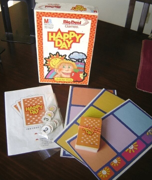 This is a simple card game with a "Crazy Eights" type mechanic. The object is have the happiest day. There is a board with 9 play areas. Chips are placed above the areas with their point values face down. Each player receives 5 cards. To start, you play a Yucky Day card (such as "Fly in your cereal...") onto the first area and inform any other player that...