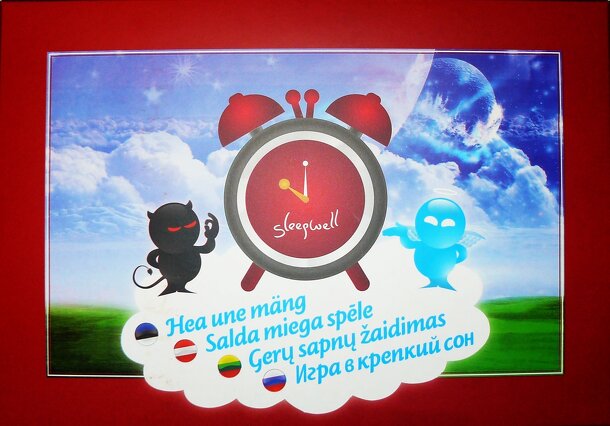 "The game of good sleep" in English. Promotional game for Hilding Anders Baltic. (Hilding Anders Group is the largest bed manufacturing group in Europe) It's like usual roll-and-move game, but instead of being the first person who reach in end You must be the last to win. Also there are 2 tracks in the board: upper is from 1 to 50 other has only 10 steps...