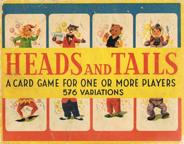 This appears to be a reproduction of an older game. From the rules: "Heads and Tails is the ideal family card game suitable for all ages. The box contains 48 cards which form 24 complete pictures and the cards can be swapped around to make 576 different pictures." In the game for several players, the cards are dealt out completely to all players and...