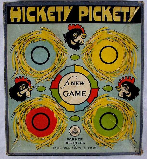 The aim of this simple children’s game is to be the first player to have his or her “nest” full of eggs. Each player is assigned a color and given 6 little wooden 'eggs' of that color. The players take turns spinning the board’s central indicator, and whenever the arrow stops on a particular color (blue, yellow, red, or green), the player who possesses the...