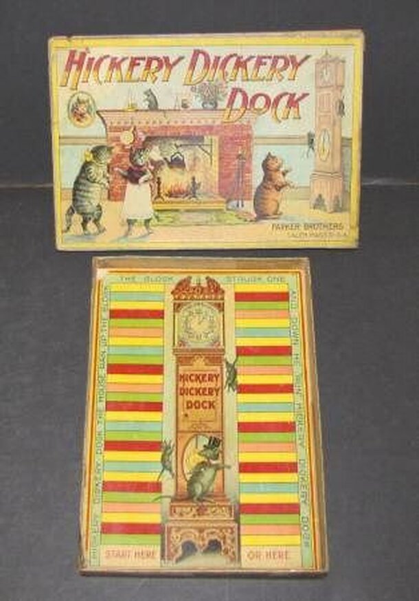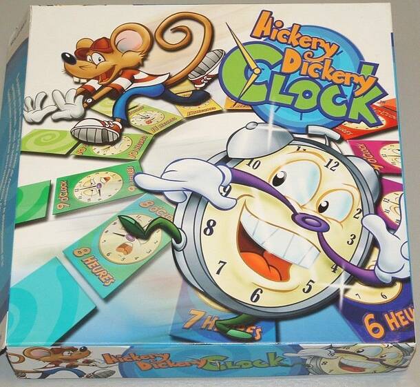 Hickery Dickery Clock is an easy game for children age 4 and up, about telling time and matching funny faces. Object: Race against Timothy Mouse by striking each hour of the clock before turning up all 4 Timothy Mouse cards. Players win by matching all the hours on the clock before the last Timothy Mouse card is turned up. Contents: 5 piece jigsaw game...