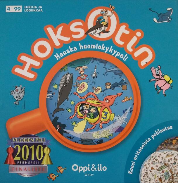 Hoksaa! is a quick pattern recognition game. Game board is a circle built on puzzle pieces with easy and harder side. The game play consists of rolling a special die that will tell players what to search this round. Some examples: blue things, loud things, square things. Sandtimer is flipped, and players try to find as many of matching things during that...