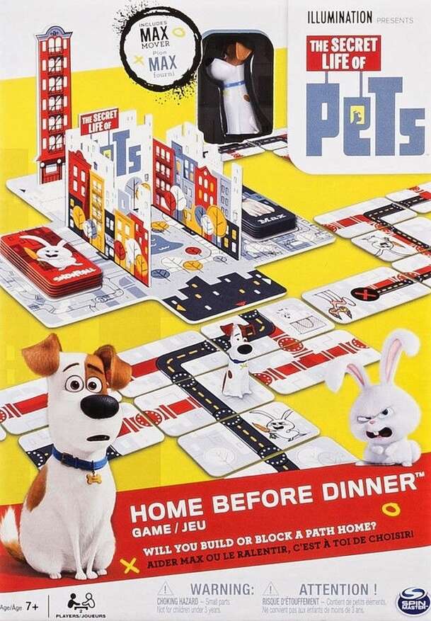 This is a game for children based on The Secret Life of Pets from Universal Studios. One player represents Max (the dog) trying to get home after spending a day in the city. The other player represents Snowball (a grumpy rabbit) trying to block any path chosen by Max. Players take turns laying pathway tiles around a 3-D board representing a park, city...