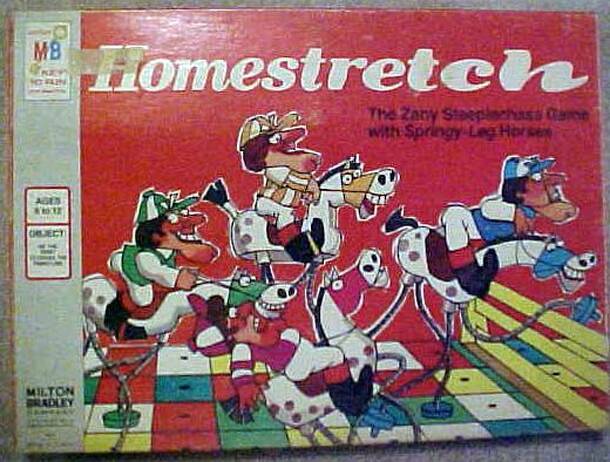 Homestretch, the wild, wacky, horse race game where four steeds, cabbage, banana, girdle and beetle bohm, stand on springs. The race begins with a spin and they're off. Each player moves one of his horse's legs by the direction of the spinner. The object is to move your horse down the track and split away from the bunch. Each player must move his horse...