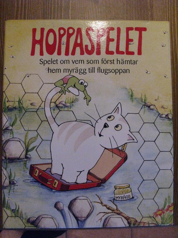 Hoppaspelet (English, The Jump Game) is a Swedish children's game based on the book and cartoon "Flugsoppan". Every player takes on the role as young frogs that set out on a hunt for ant eggs. These eggs are to be used as the main ingredient in Mommy and Daddy Frogs' famous fly soup. The first player to return home with a jar 'o ant eggs wins. The ant eggs...