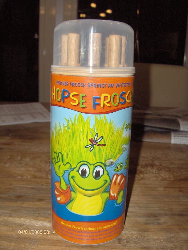 Which frog jumps the furthest? Place all frogs in a line and place the top of the tube at a certain distance. Then each player chooses one of the 8 sticks and places that in front of his/her frog which then jumps over the stick. Did you pick the stick with the red tip? Then you have to skip a turn. The player who jumps into the pond (the tube top) first...