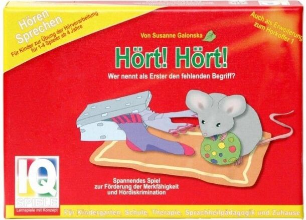 In Hört! Hört! (Hear! Hear!) A board showing several objects is placed on the table. (The game comes with various different boards.) Then, the board is covered, and a card is drawn which names all of these objects but one. This card is read out loud, and the players have to name the object that was missing. The first player to give the right answer keeps...