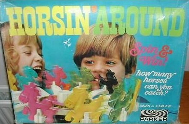 Horsin' Around is a children's game of dexterity from the 1960s. Horse tokens are placed on a carousel which is spun around. Pressing a button launches one of the tokens in the air and players attempt to catch it. There are three tokens in each of four colours and a 13th black horse. If a player catches a coloured horse they keep it but if a player catches...