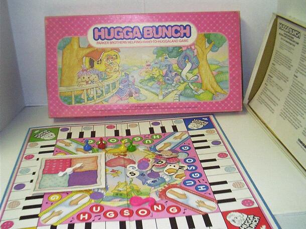 In this children's game, players take a make-believe trip to Huggaland to meet the Hugga Bunch. On your turn, you spin the spinner and advance along the piano key spaces until you land on the key with the color dot that matches the color on the spinner. You then draw a chip of the same color from the center of the board and turn it over. If it's a letter...