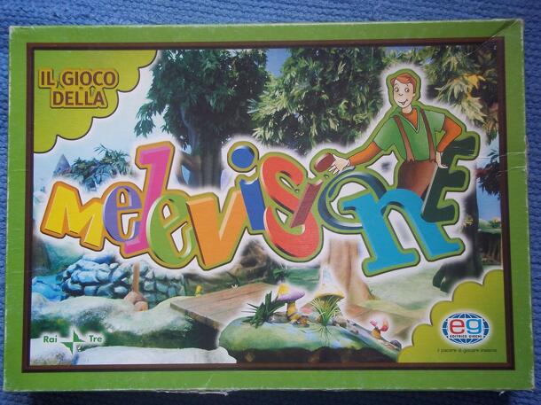 A game about an Italian TV-series, the Melevisione. The main characters have lost their favourite objects and the players must help them to find back three, randomly chosen at the start of the game. The children roll and move on the board and visit some locations, each hiding 2 items (face-down tokens). When coming to a location, they may secretly look at...