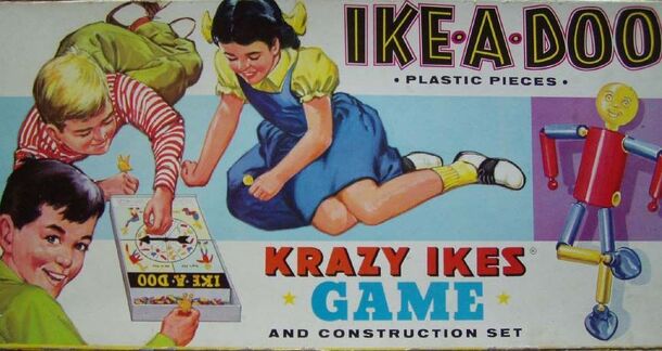 Object: To assemble, piece by piece, one of the figures on the spinner board. Each figure has twelve parts which are to be chosen by shape and not necessarily by color. First player who completes h is figure and calls, "Ike-A-Doo" is the winner. Colorful, nostaligic game of putting together legs, heads, arms, feet and torsos into robotic-like figures...
