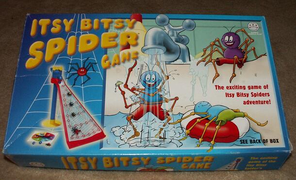 "The exciting game of Itsy Bitsy Spider's adventure!" Itsy Bitsy Spider Game is a children's game for two to four players Ages 4 and up. The main board of the game is a spiderweb angled at 45 degrees with a tap (faucet) at the top which, when turned, releases a small blue ball. Playing pieces are small spiders which slot into the board. Movement is...