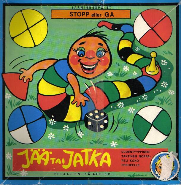 "Stay or Go" This is a fairly basic roll-and-move aimed to teach children color recognition and set collection. The game board is a spiral-shaped worm divided in coloured segments (4 colours/black with number/white). Players start in the head and move towards the tail. Landing on a coloured space gives the player one counter (quarter) of that colour;...