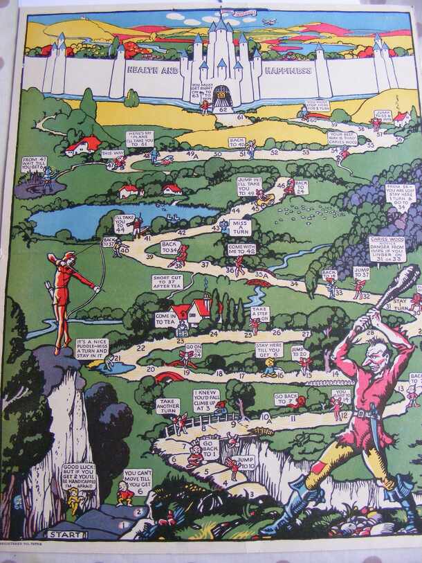 Advertisers variant of Snakes and Ladders, produced in 1935 to advertise D& W Gibbs "Dentifrice" Toothpaste. Size approx.35cm X 46cm when unfolded (central fold). Printed on cardboard - board has two holes and a string at the top to allow it to be hung up as an advertising item. Rules are printed on the rear of the board. Includes dice and 4 coloured...