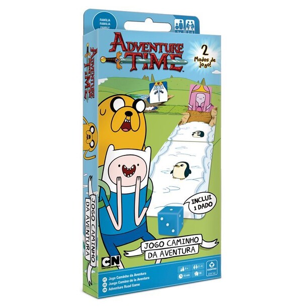 A simple children´s game that has 2 phases. In the first, you lay cards from your hand, building a road in the kingdom of Ooo using a mechanic that is similiar to dominoes. In the second phase, the game has a simple roll and move mechanic and landing on spaces that tell you to move forward or backward some spaces, makes you or your opponent lose your turn...