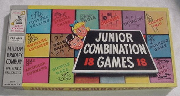 This game by Milton Bradley copyrighted 1905 features a number of table games all combined in the same box. Included are India, Johny Jumps, Railroad Game, Puss in the Corner, Fortune Telling, Checkers, Covering the Pig, Steeplechase, Bicycle race, Hop, American Corners and Yacht Race. Game came with numerous Bits and pieces used as playing pieces for any...