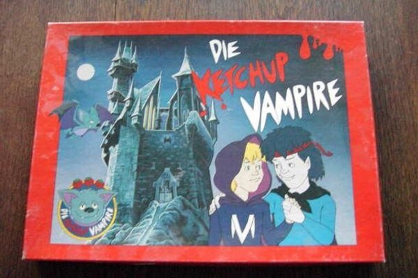 Simple children's board game in which the so called Die Ketchup Vampiere struggle against the evil "Blutwurst Vampiere" to regain the lost book from the woods in the centre of the board. Every player draws a card which either shows a garlic or a tomato. The player has to guess what of these two it will be. If he guessed right he may move his vampire...