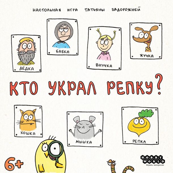 You play detective chickens who are looking for turnip thief. All seven suspects are depicted on the game board this is: grandfather, grandmother, granddaughter, dog, cat, mouse and the turnip itself. Next to each suspect lies a round token, on the underside of which it is indicated, who is this character: innocent, kidnapper or accomplice. Chickens walk...
