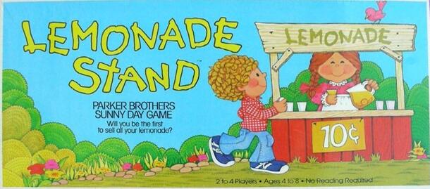 In this game, you try to be the first player to sell all the lemonade at your stand. A deck of numbered "glasses" is dealt evenly to the players. On your turn, you spin the spinner and advance the number of spaces indicated. If you land on a Customer Space, you may place your top glass on it if it is empty, or if the number on your glass is exactly one...