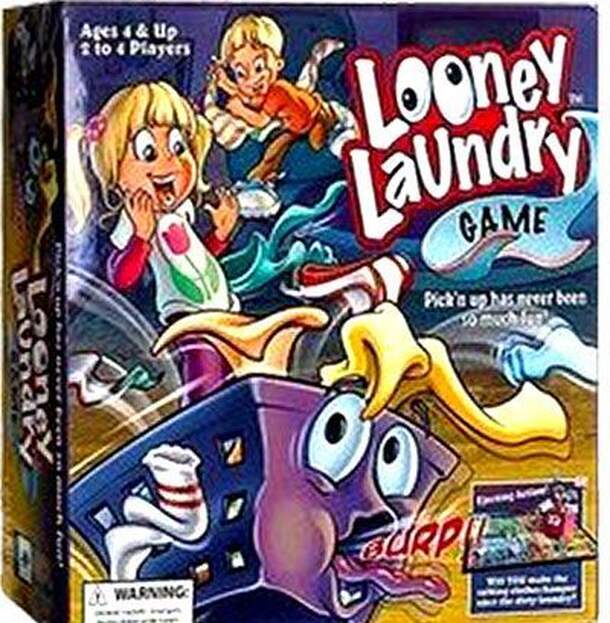 Looney Laundry is a game designed for children ages 4 and up. The object of the game is to be the first player to successfully discard all their laundry pieces into the talking, electronic laundry hamper. After each roll and subsequent movement, the players push the hamper's eyes where he will either tell you what a good job you're doing, lose a turn or...