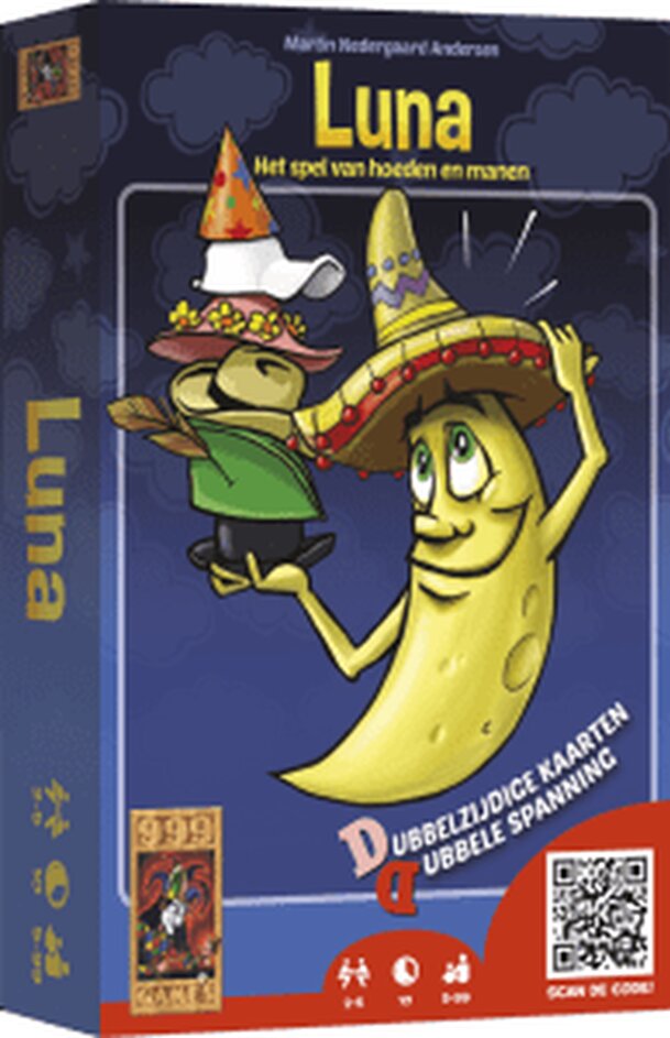 Card game from the "Dubbel en Dwars" series. All cards are printed on both sides. During the game you need both sides! In Luna, each player tries to get rid of his cards as fast as possible. Each card shows a moon or a hat. One card is turned over, and players simulteanously look through their cards for two or more cards with a matching object, and place...