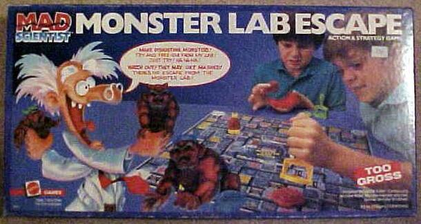 This board game was part of the Mad Scientist line of toys. Players mold monsters out of `monster flesh' clay and try to get them to escape the lab. In addition to trap door and acid spill (lose a turn) squares there are many squares that allow you to mash your opponent's monsters. Components include a spinner, monster flesh, a monster mold, monster feet...