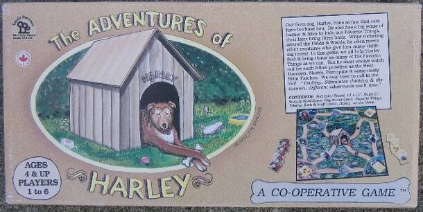 Centered around the family dog, Harley, who likes to hide our Favorite Things, The Adventures of Harley is a co-operative children's game. The goal is to move Harley around the board and turn over cards from four stacks, revealing Dangerous Animals (Bear, Raccoon, Skunk, Porcupine), nasty Briar Patches, Dog Powers (Bark and Sniff), and Favorite Things...