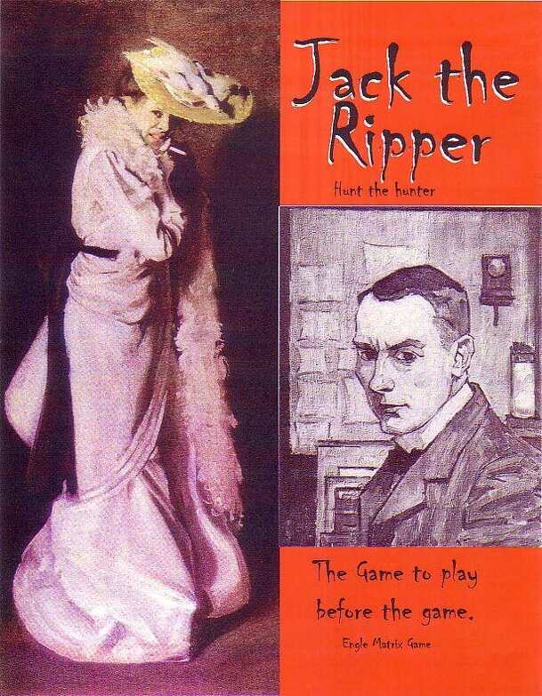 Jack the Ripper is an Engle Matrix Game about hunting down London's most famous mass murderer. The players each champion one of six characters: Jack the Ripper, The Inspector, Lady Coverup, Lord Brutal, Mr. Revenge and Pretty Nell (everyone's victim). Each character has conflicting goals which lead them to try to pin the murders on one another or try to...