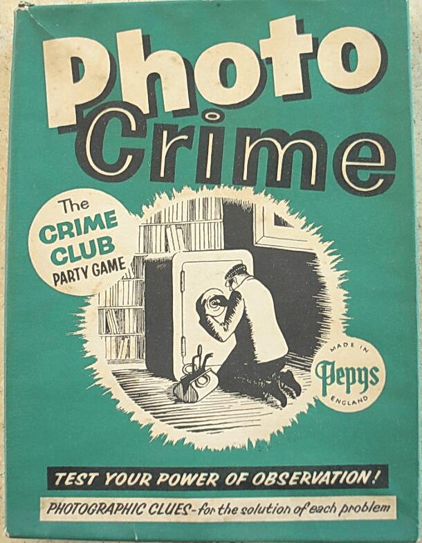 From the Box: "The Crime Club Party Game" "Test Your Power of Observation" "Photographic Clues - for the solution of each problem" 12 cards are included, three copies of four types. Each card bears a photograph of a crime scene and a description of Inspector Cameron interviewing a suspect. Something in the picture reveals the suspect to be lying, and this...