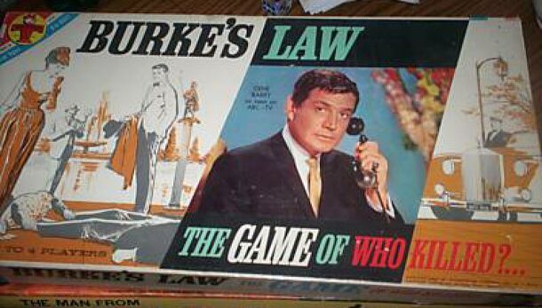 Burke's Law game by Transogram from 1963. Based on the hit ABC show starring Gene Barry. The board shows the outline of two large houses - a country house and a city house. Inside each house are squares that are the possible rooms where the murder could have occurred. There are three possible murder weapons - gun, knife or poison, and four tokens for each...