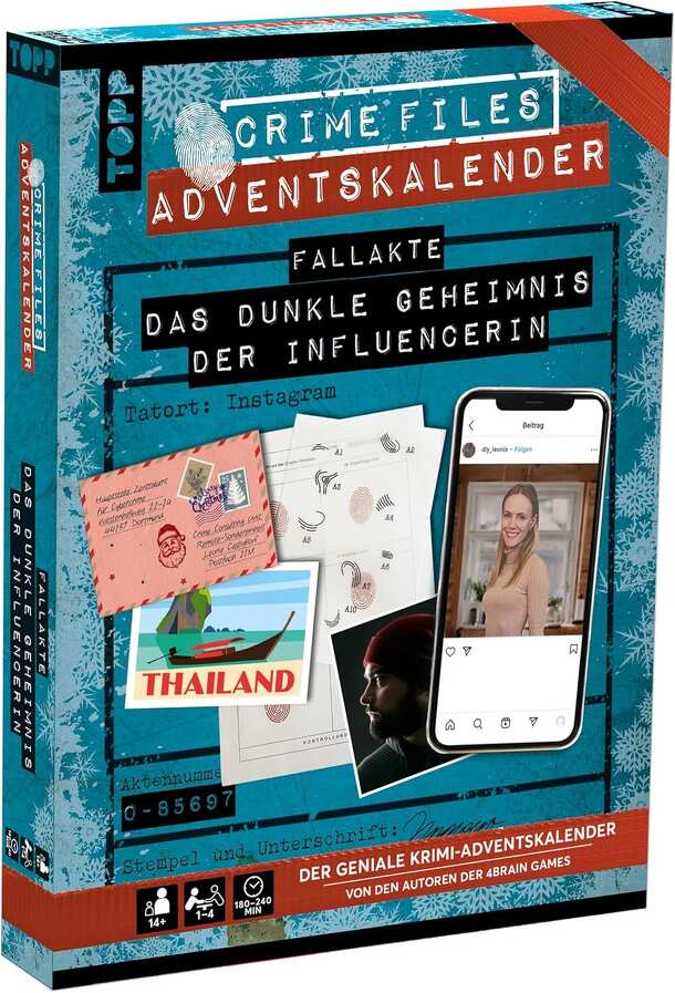 Crime Advent calendar: The daily social media posts will put you on the trail of the missing influencer! View the authentic evidence, follow the posts on Instagram and solve the case! An influencer with a large reach disappears shortly before Advent. Does her content hold the key to solving the case? Every day you open an envelope with evidence and see a...