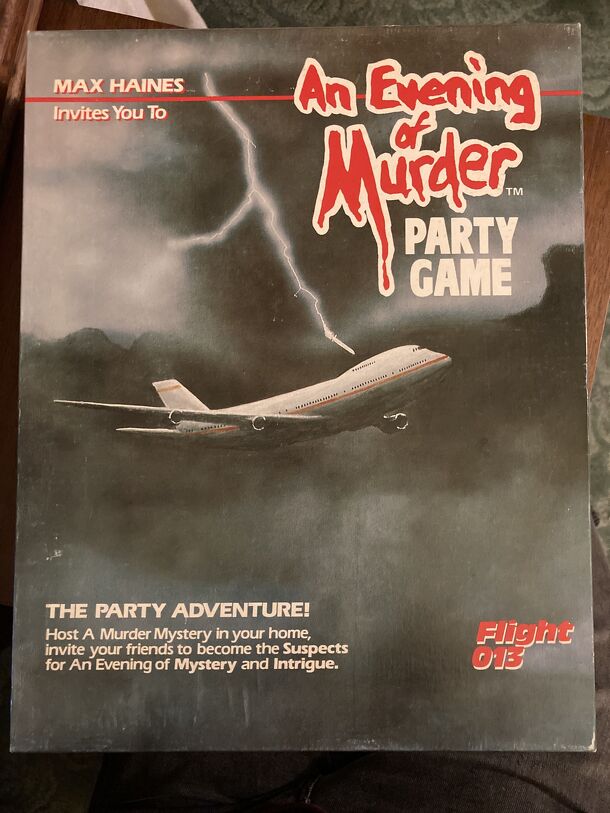 One in the series of "Max Haines Invites You To An Evening of Murder (tm)" party games. Plays like the "How to Host a Murder" series. This particular edition is "Flight 013." It's in a smaller box than all the other editions and may have been associated with Waddington Games (damaged box, can only read 'Wadd'). From the invitations... Crime Scene: Thomas...