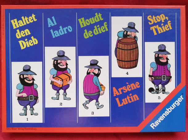 This game uses a similar mechanism as later used by Baggage Claim aka Wettflug (Randolph) and The Prestel New York Architecture Game (Fackler): There are ten stacks of cards. The cards tell the story of 8 thieves, each story consists of 5 parts. All parts are shuffled. Now, on a turn, a player can take 1 pile and look at the top 3 cards, choosing one of...