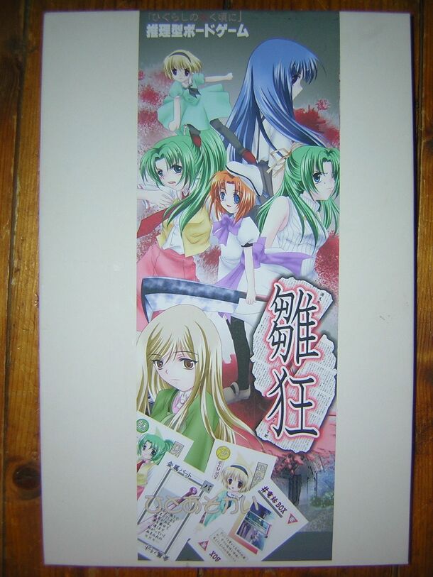 Home made variant of Clue/Cluedo, based on the Japanese comic/animation "When they cry…" (Higurashi no naku koro ni) Differs from standard Cluedo in many ways, mostly due to the fact that not all cards are distributed from the beginning, some are placed on the board. A hand limit also forces players to sometimes put down cards onto the board. Corridors are...