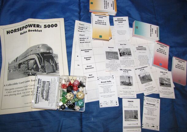 From the Rules Booklet: Horsepower: 5000 is a card game about railroading. Players use three pairs of decks that they can customize to connect places with rights-of-way and track. They use trains, cars and other special cards to compete for the loads the places produce. Play follows the history of railroading through three phases (from the 1830's through...
