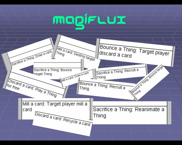 MagiFlux is a card game for 2-4 players. The inspiration for this game came from Fluxx and Magic:The Gathering. Objective of the game is to be the first to have cards in play that have a total of 10 Victory Points. At the beginning of each turn, a player takes the top card from his own library, and untaps all resources. During each turn, a player may play...