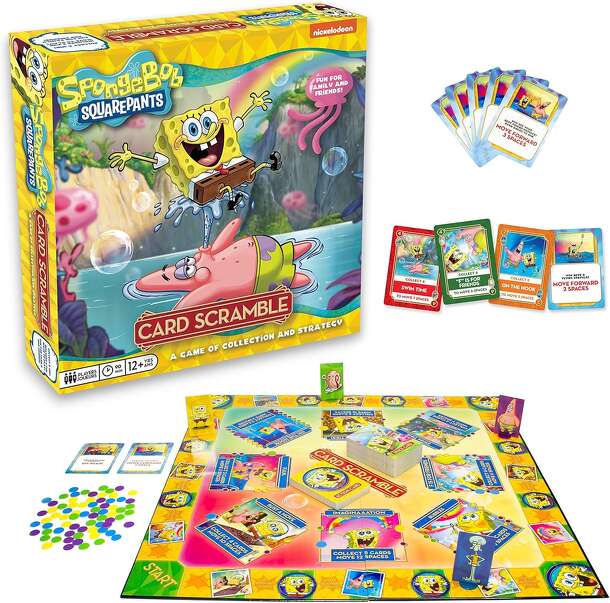 SpongeBob Card Scramble is a family board game set in the world of Bikini Bottom, where players collect and match cards while strategizing to outplay their opponents. Players move their character pieces around a SpongeBob-themed game board, aiming to be the first to complete their collection and make a full circuit of the board. Gameplay involves...