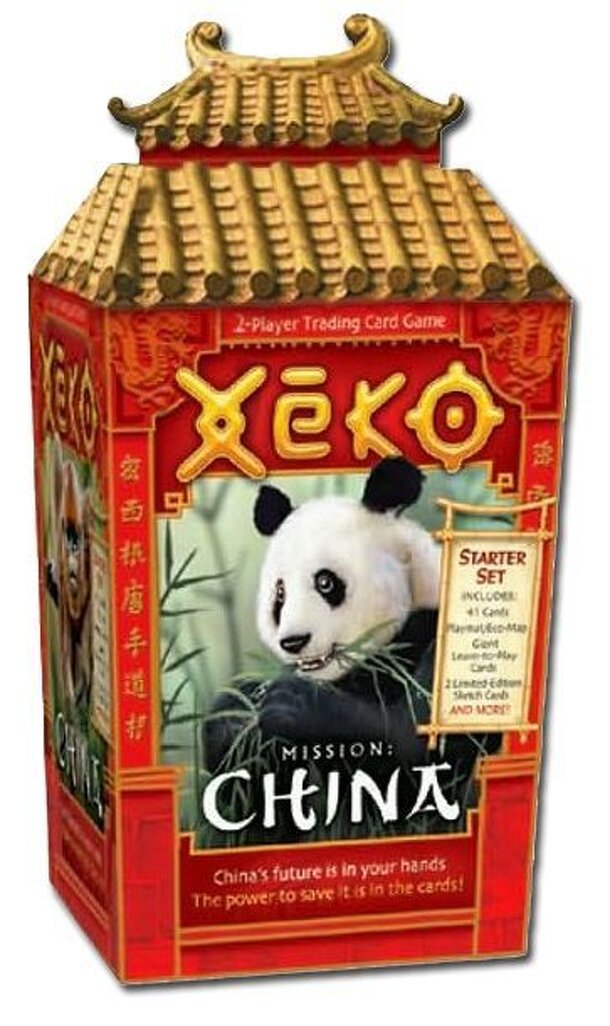 The Mission: China Starter Set comes in a pagoda-roofed box made from recycled paper. Includes an oversized playmat with an eco-map on the back, 43 cards (4 Endangered, 14 Rare, 23 Common, two limited-edition sketch cards) for a 2-player game, giant learn-to-play cards, and a rulebook Xeko cards are printed on recycled paper with eco-friendly inks. Xeko...