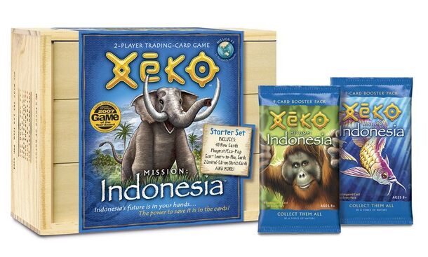 The Mission: Indonesia Starter Set comes in a wooden cargo crate shaped box made from recycled paper. Includes an oversized playmat with an eco-map on the back, 43 cards (4 Endangered, 14 Rare, 23 Common, two limited-edition sketch cards) for a 2-player game, giant learn-to-play cards and a rulebook. Xeko cards are printed on recycled paper with...