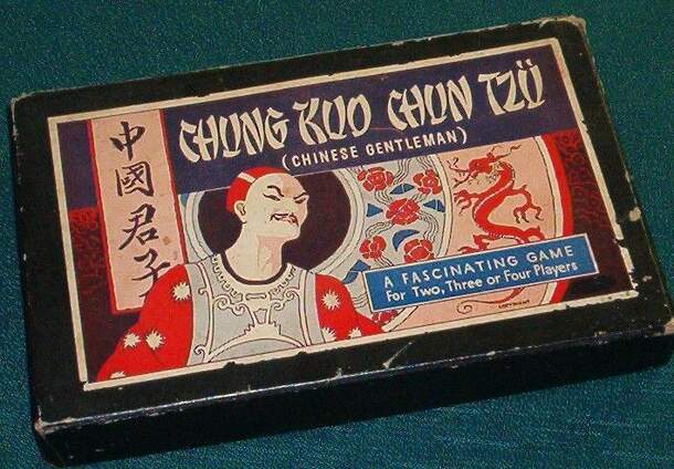 The game box includes four sets of colored wooden blocks used to complete & build a Chinese gentleman (head, arms, legs, torso, feet & coolie style hat), a removable bulls-eye target tray for throwing the six supplied colored beans (dice) into, and a small rules leaflet. Players take turns using the supplied dice box, to throw six uniquely colored beans...