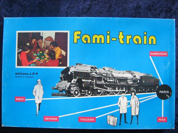 A French family game from the late 60ies/early 70ies. Game consists of a large gameboard depicting a railroad track, 12 cardboard locomotives in 6 colours, a load of cardboard wagons, movement and hazard cards, 6 player mats, two dice and a load of commodity cards. Aim of the game is to be the first to add 5 wagons to your locomotive and to fill these...