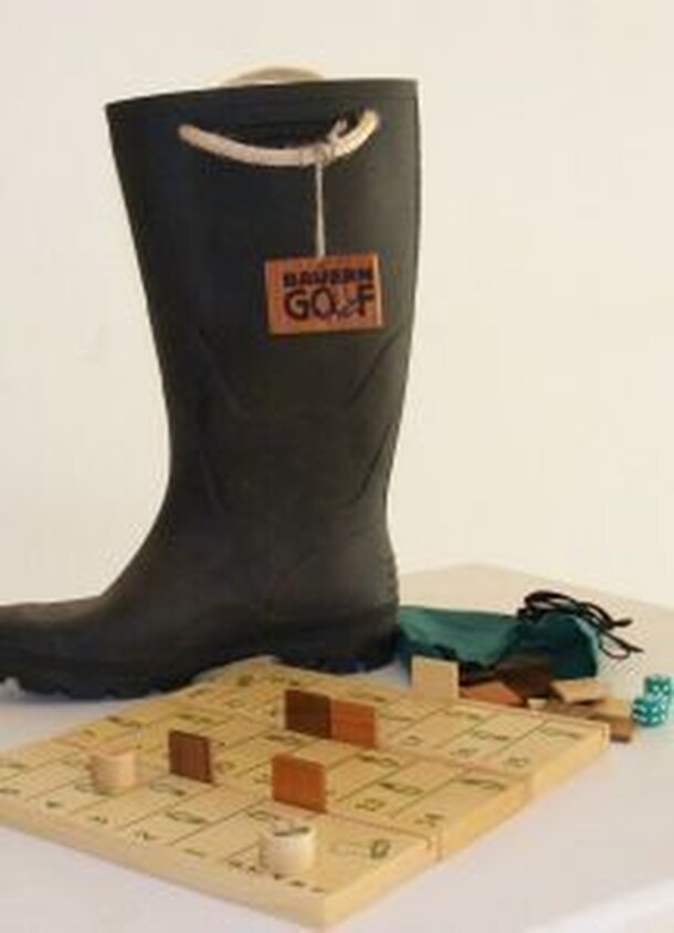 This game is packed in an actual rubber boot, which is also part of the game. The wooden board has 21 fields (7 x 3), several wooden tiles are inserted in gaps. During the game, the players have to get rid of their own tiles by inserting them (thus changing the meaning of the fields they are adjacent to), then rolling a die and moving with a boot piece....