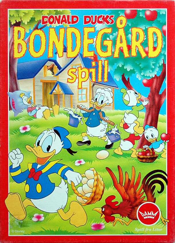 In Donald Ducks Bondegårdspill (Donald Duck's Farm Game), the players play Hewey, Dewey and Louis (and perhaps Phooey ?) on Grandma Duck's farm trying to collect a complete set of apples, milk, corn and egg. Contents: - Game board - Wheel with needle to attach to the board - Four playing pieces with plastic feet - 16 pieces of apples, milk, corn and egg -...
