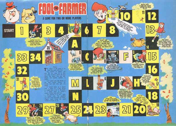 Game from The Beezer Book, 1976. The object of the game is to reach the apple store first. Any number of players can play. All you need are a dice and some counters. Throw the dice before the game. The one who throws the lowest number is Farmer. Each player gets two throws at the start except Farmer. He throws last and only gets one throw. If Farmer lands...
