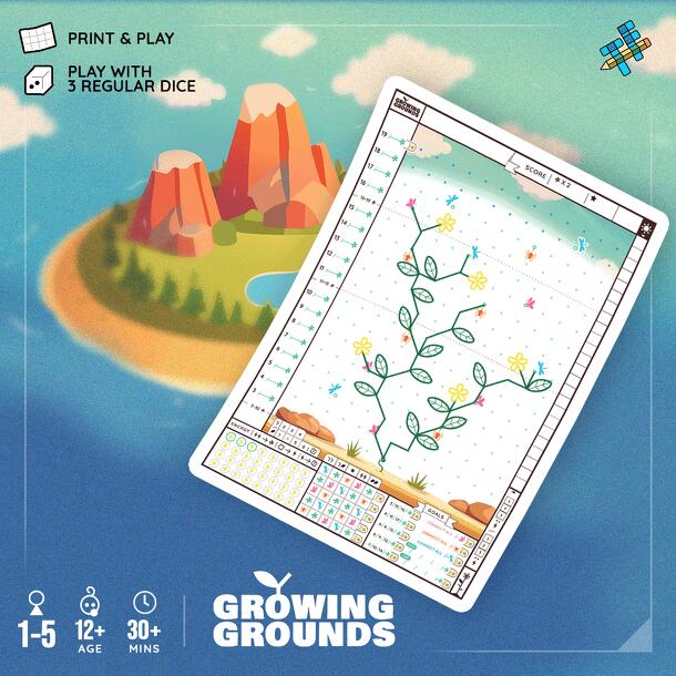 Growing Grounds is a chill yet strategic roll & write, print & play game where you cultivate a mysterious plant on a forgotten island. Using dice to grow stems, add leaves, and bloom flowers, you'll unlock bonuses, connect with insects, and complete different goals—all while telling your story of growth and discovery. With beautifully simple mechanics...