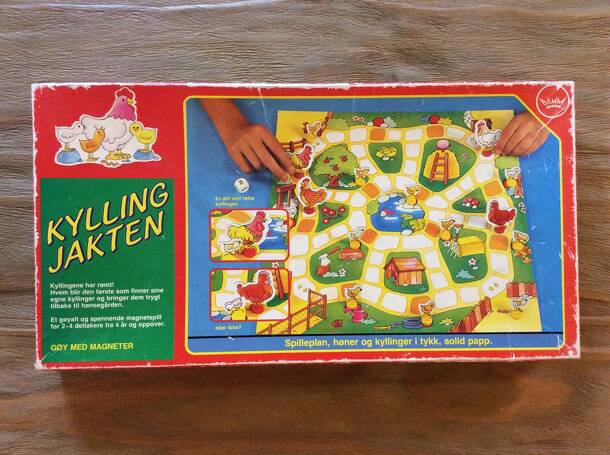 Kyllingjakten is a children's game with an interesting use of magnets. The players move a hen around the board to try to find her missing chickens. When the hen reaches designated places, the player moves them next to the nearby chicken to see if they attract each other. If they do, they belong together, and the player must bring the chicken back to the...