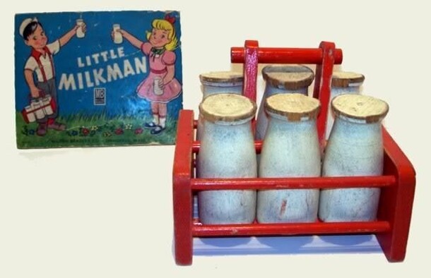 From the flyer: "Children love to play this familiar 'make believe milkman or milkmaid' game. they can make their own deliveries and collections or even run their own dairy business." The game components are beautifully crafted. Six wooden enameled milk bottles fit neatly inside of the sturdy steel wire carrier container or a red wooden carrier in later...